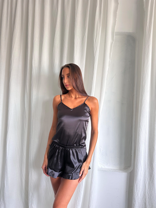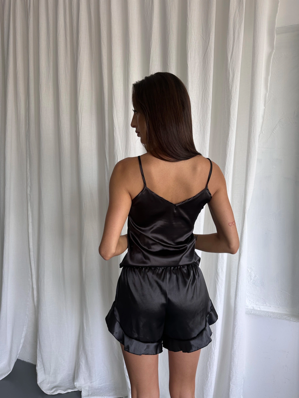 Pijama dos piezas musculosa y short con volado, confeccionado en tela saten elastizado❤️